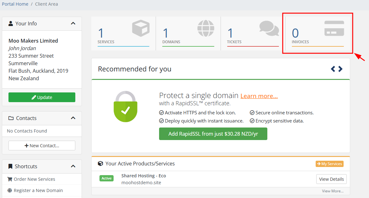 Your My Moohost account allows you to conveniently view all your invoices from one place. Do the following to view your invoices from your My Moohost account: