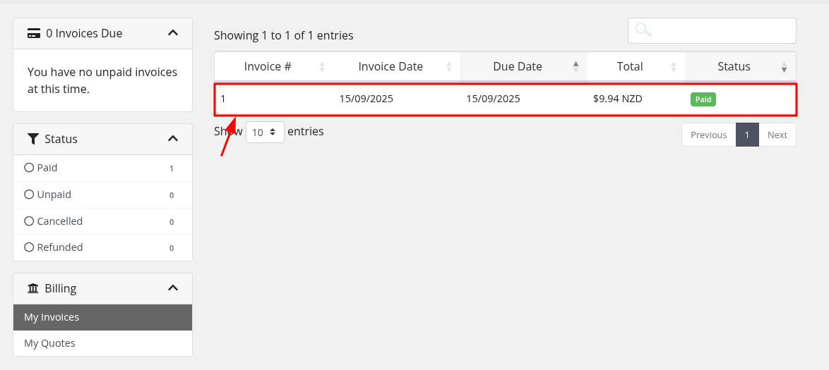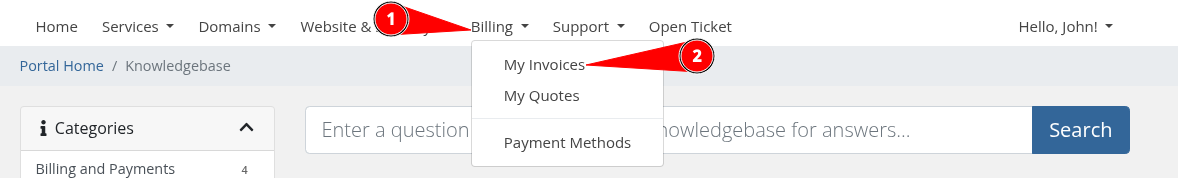 You can also view a list of all your invoices by clicking on Billing > My Invoices from the header menu: