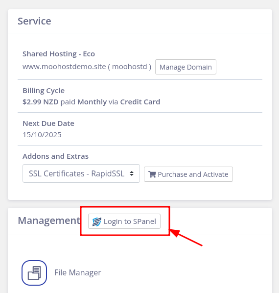 Alternatively, you can log in to your SPanel from your My Moohost account by clicking on the Login to SPanel button from the service details page of your hosting: