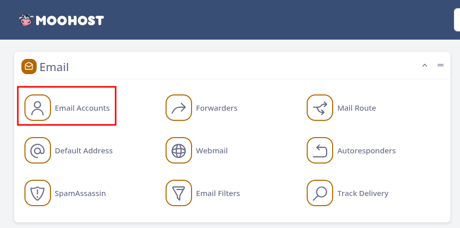 Once logged in to SPanel, click on the Email Accounts option to list any email accounts you already have, or to create a new one: