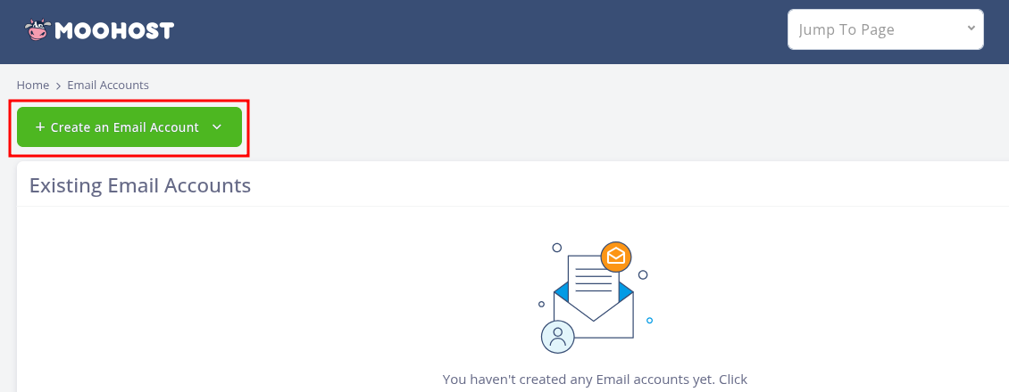 On the Email Accounts page, click on the Create an Email Account button at the top to start: