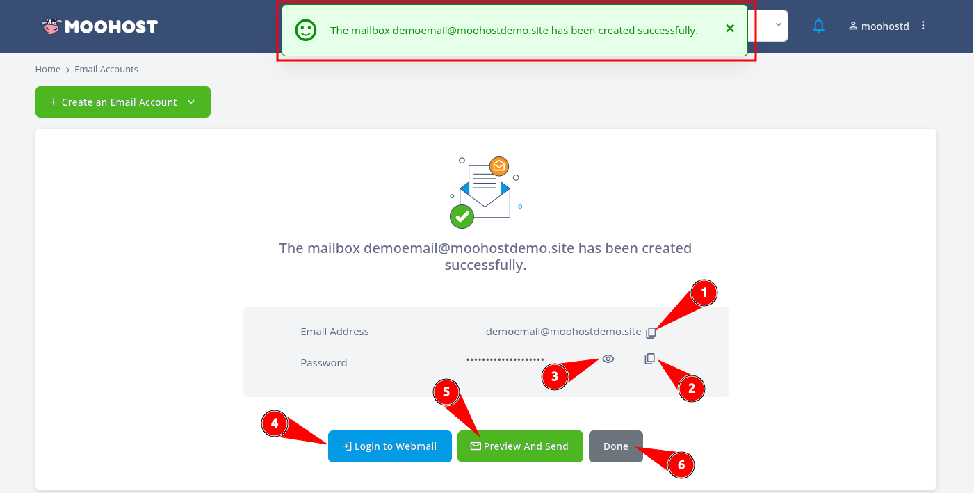 - Clicking on the Preview And Send button will open up a dialogue box where you can send important details about this email account to another person. This is particularly useful for sending information about setting up an email client for the new email account.
