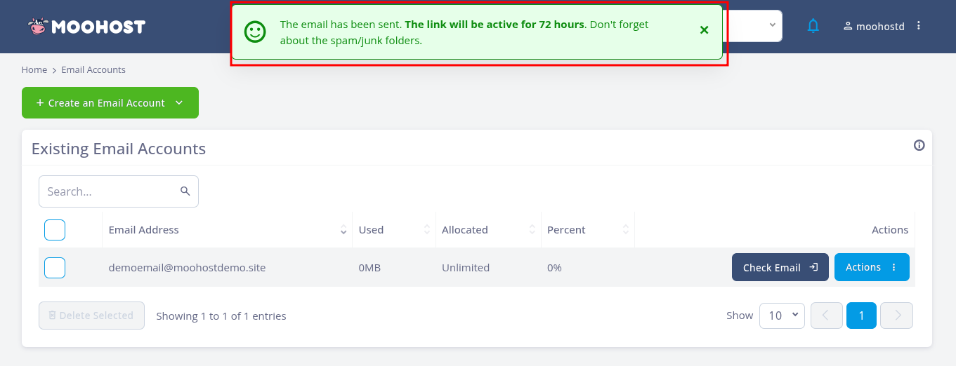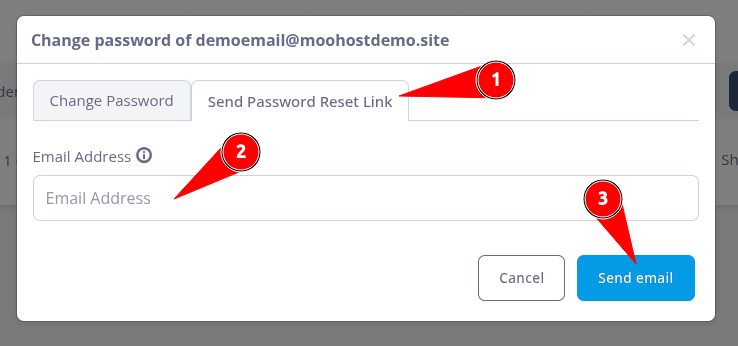Using this option, you can send a link to a different email address which can be used to change the password of the email account. This is particularly useful when the email account user is different from the person who is administering the web/email hosting account.