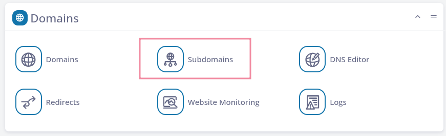 Scroll down to locate the Subdomains menu item in the Domains category: