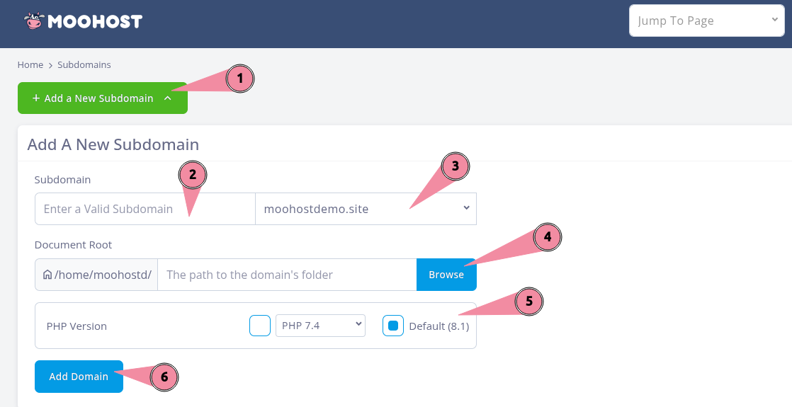 - Click on Add a New Subdomain button to open up the settings for your new subdomain.