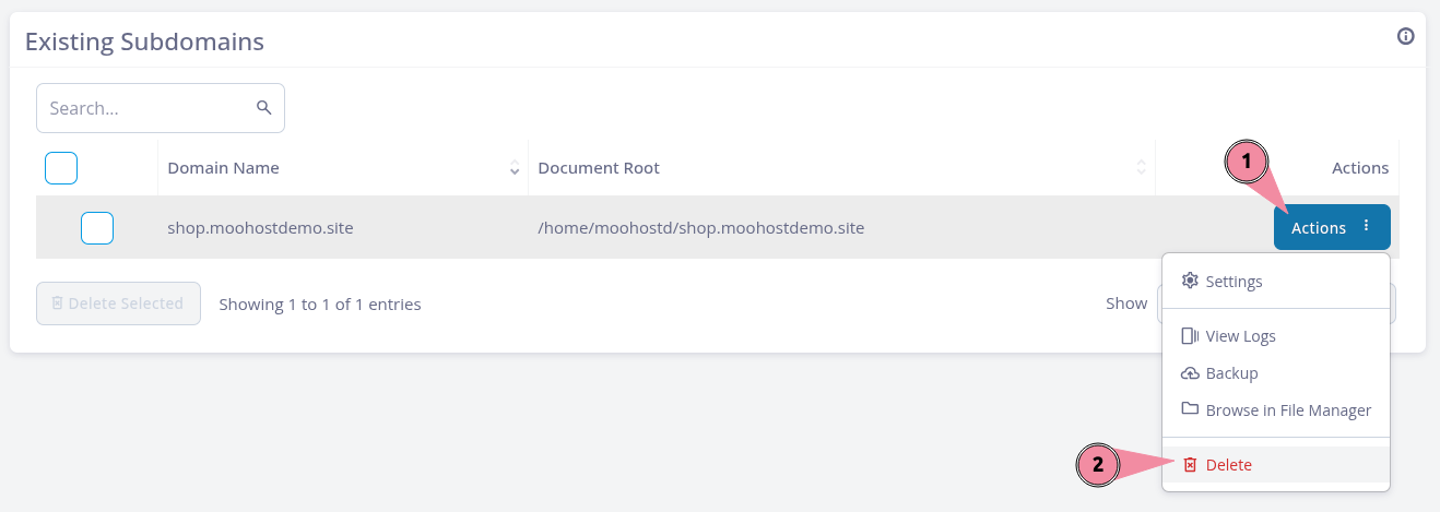 - Click on the Actions menu item to reveal the options for your subdomain.