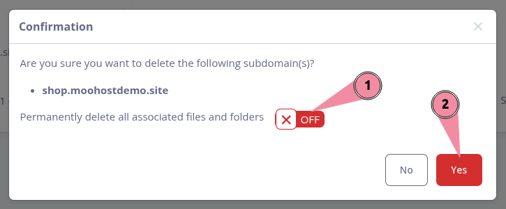 - Clicking on Yes will confirm your action and your subdomain will be deleted.